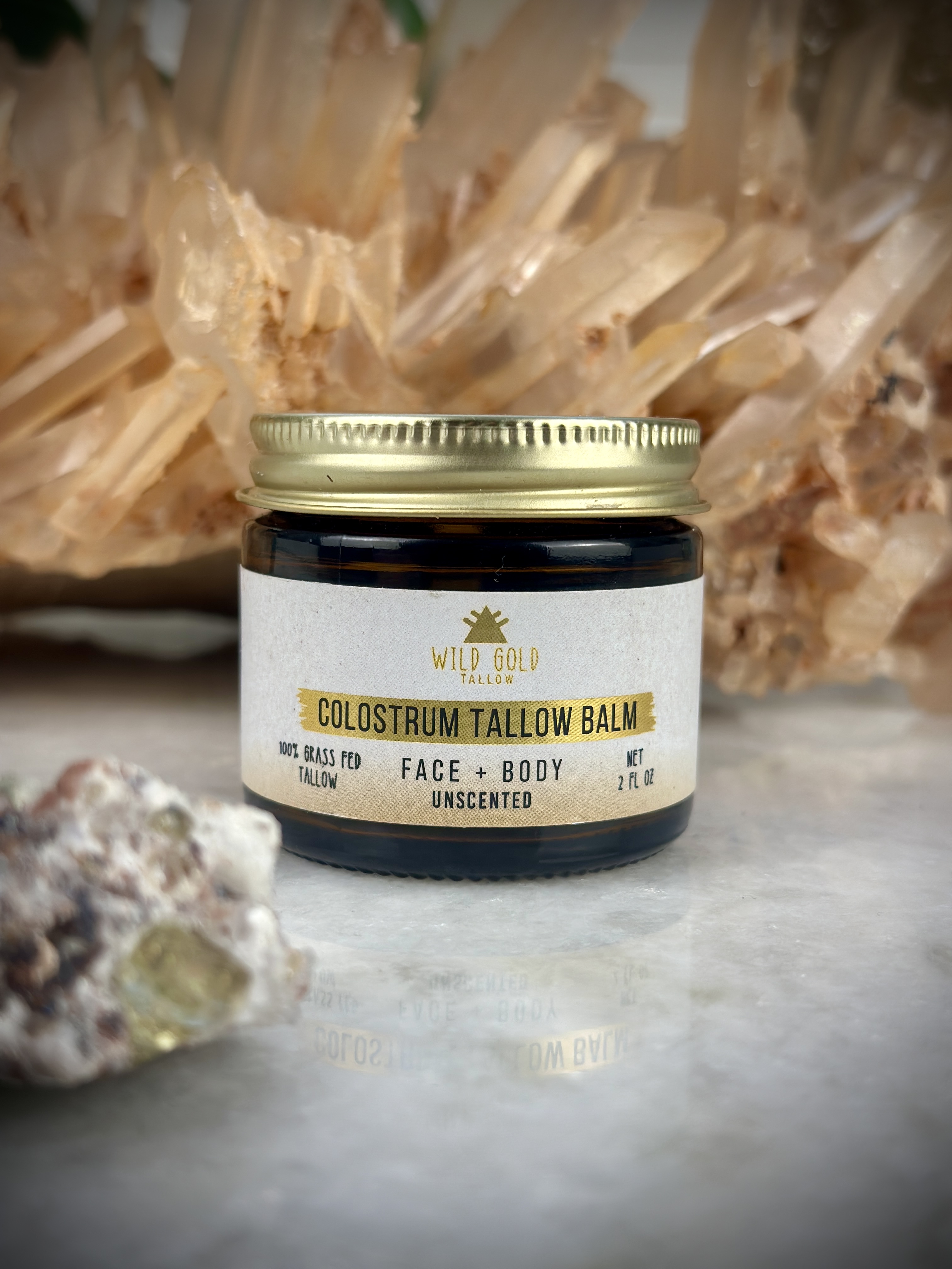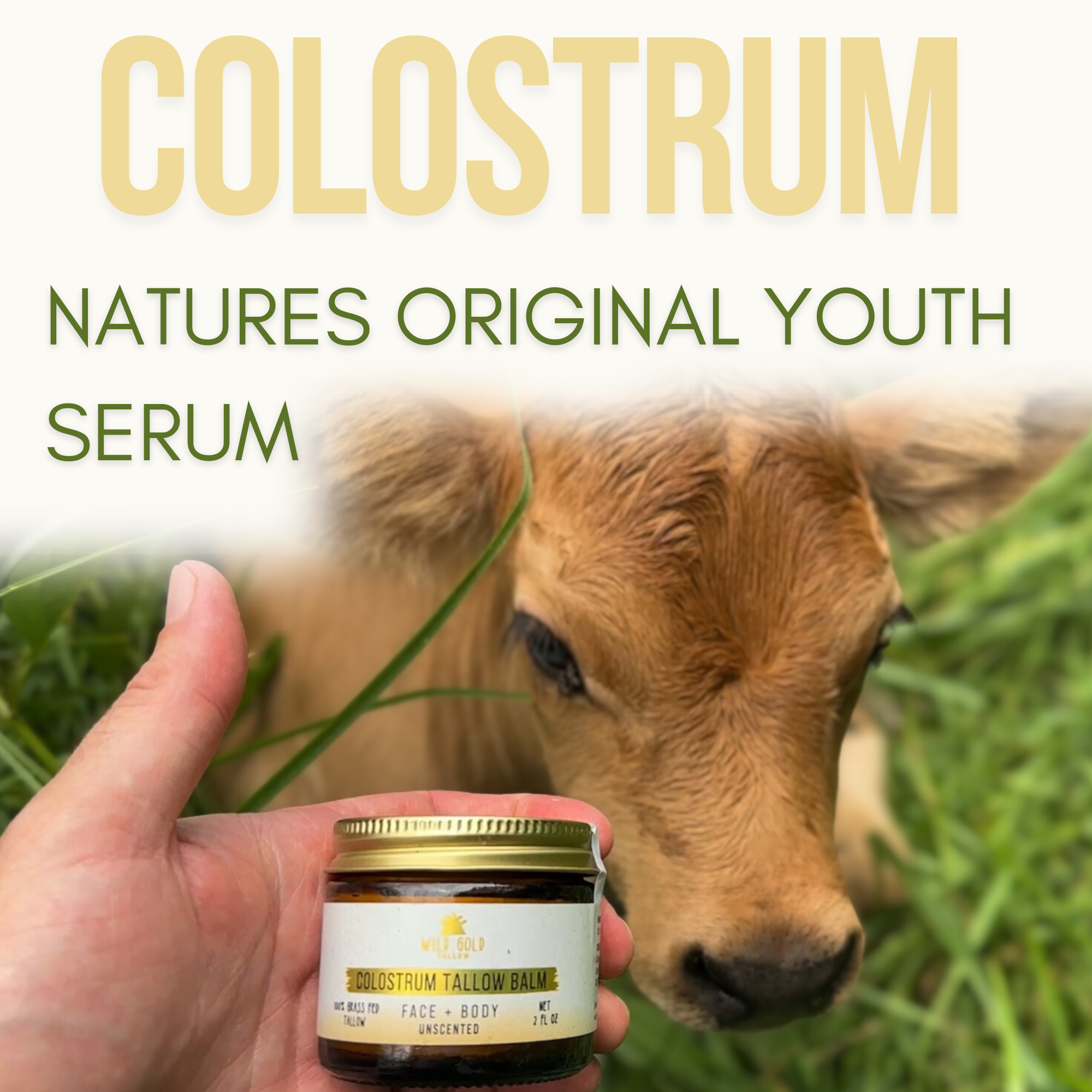 Wild Gold Colostrum Tallow Balm is a radically simple, three-ingredient skincare solution made with 100% grass-fed tallow, true first colostrum, and American-sourced emu oil. Our pioneering blend delivers nature's most potent form of colostrum straight to your skin.